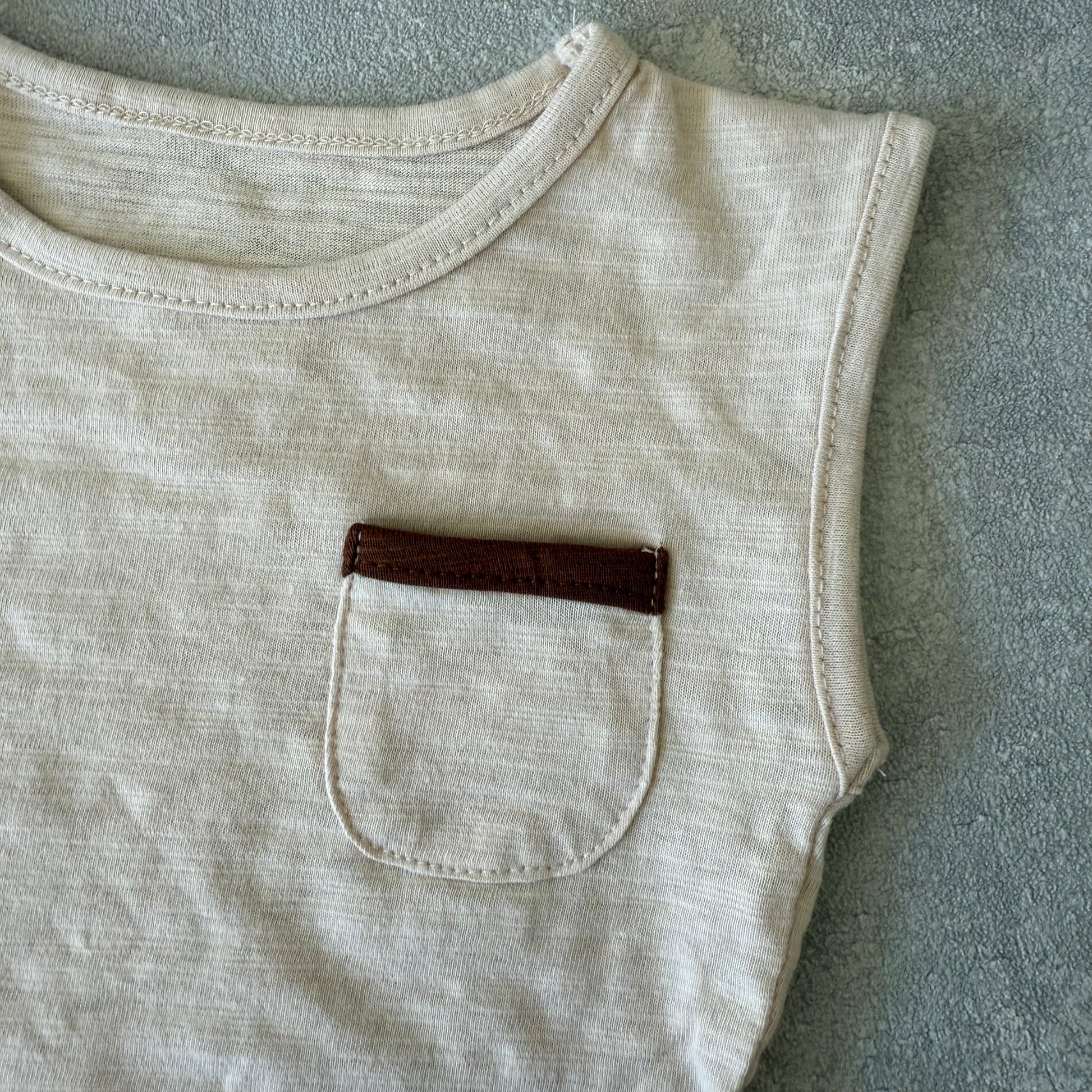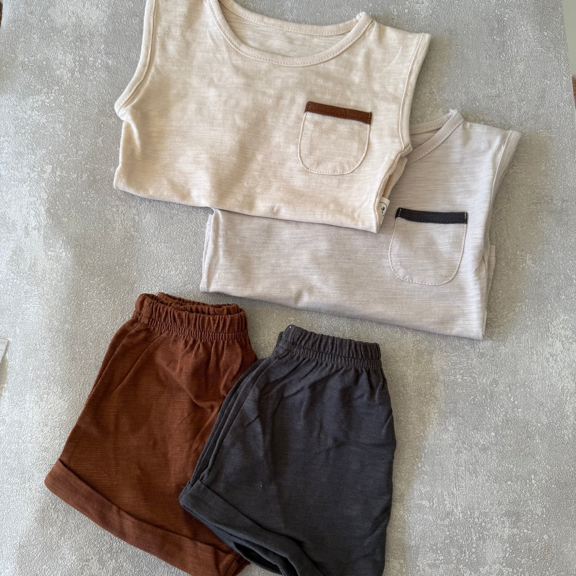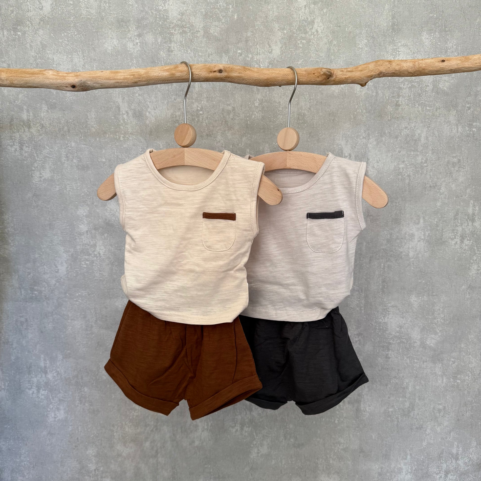 Deze zomerset is perfect voor actieve kinderen die graag vrij bewegen. De set bestaat uit een mouwloos shirt met een subtiel contrasterend borstzakje en een zachte short in aardetinten. Een ideale combinatie van comfort en stijl, dag in dag uit.