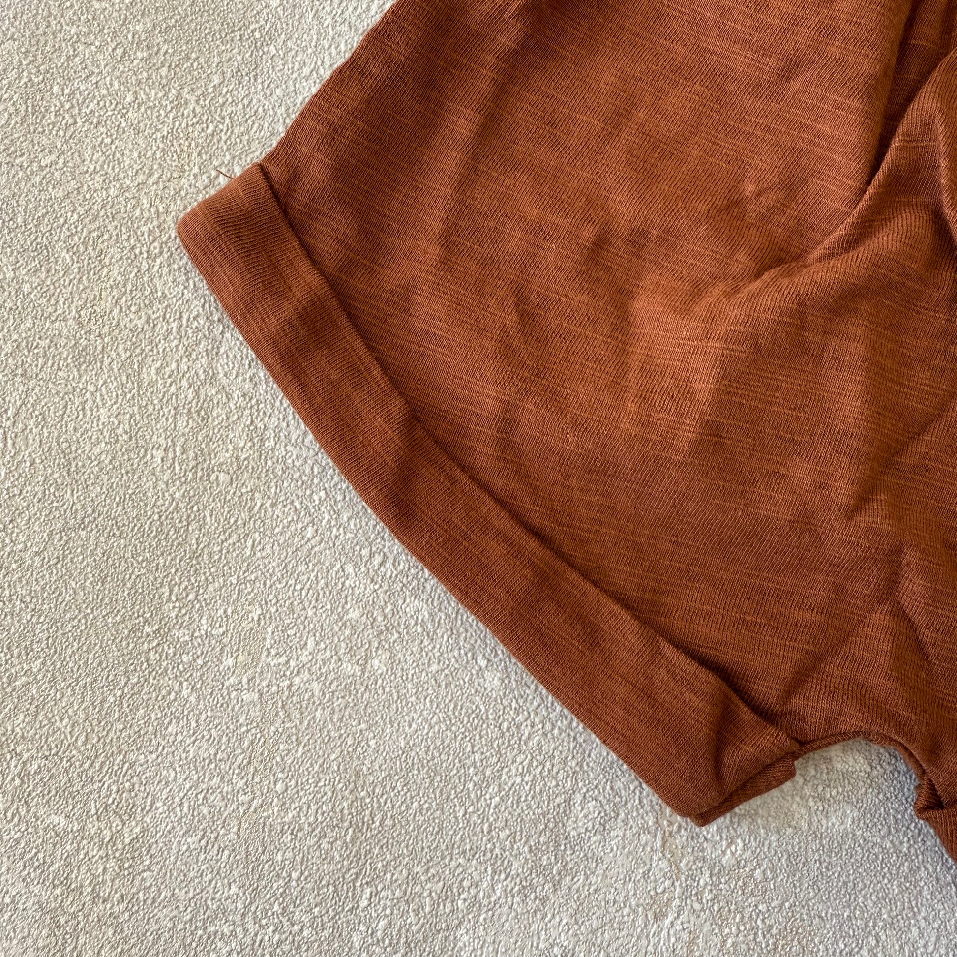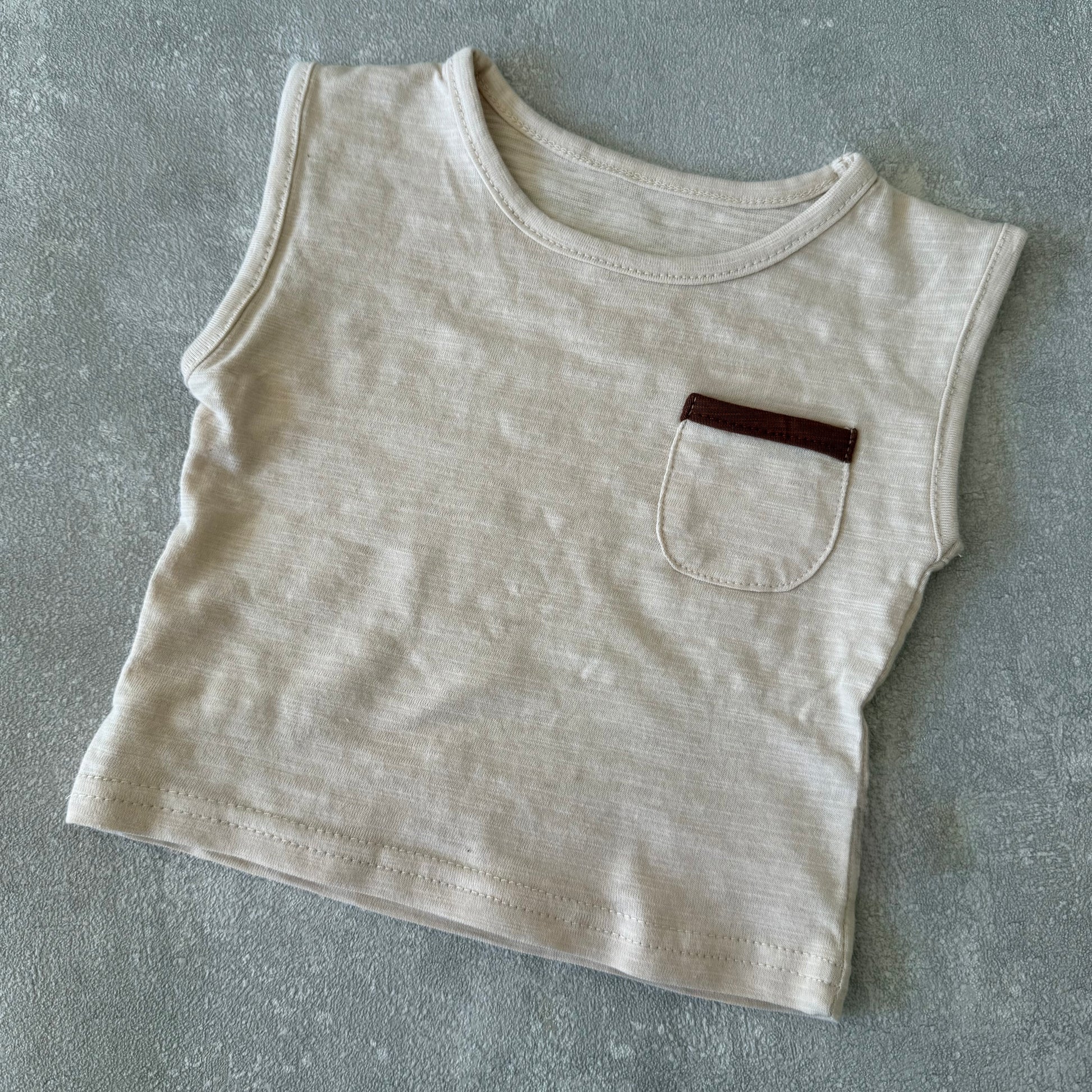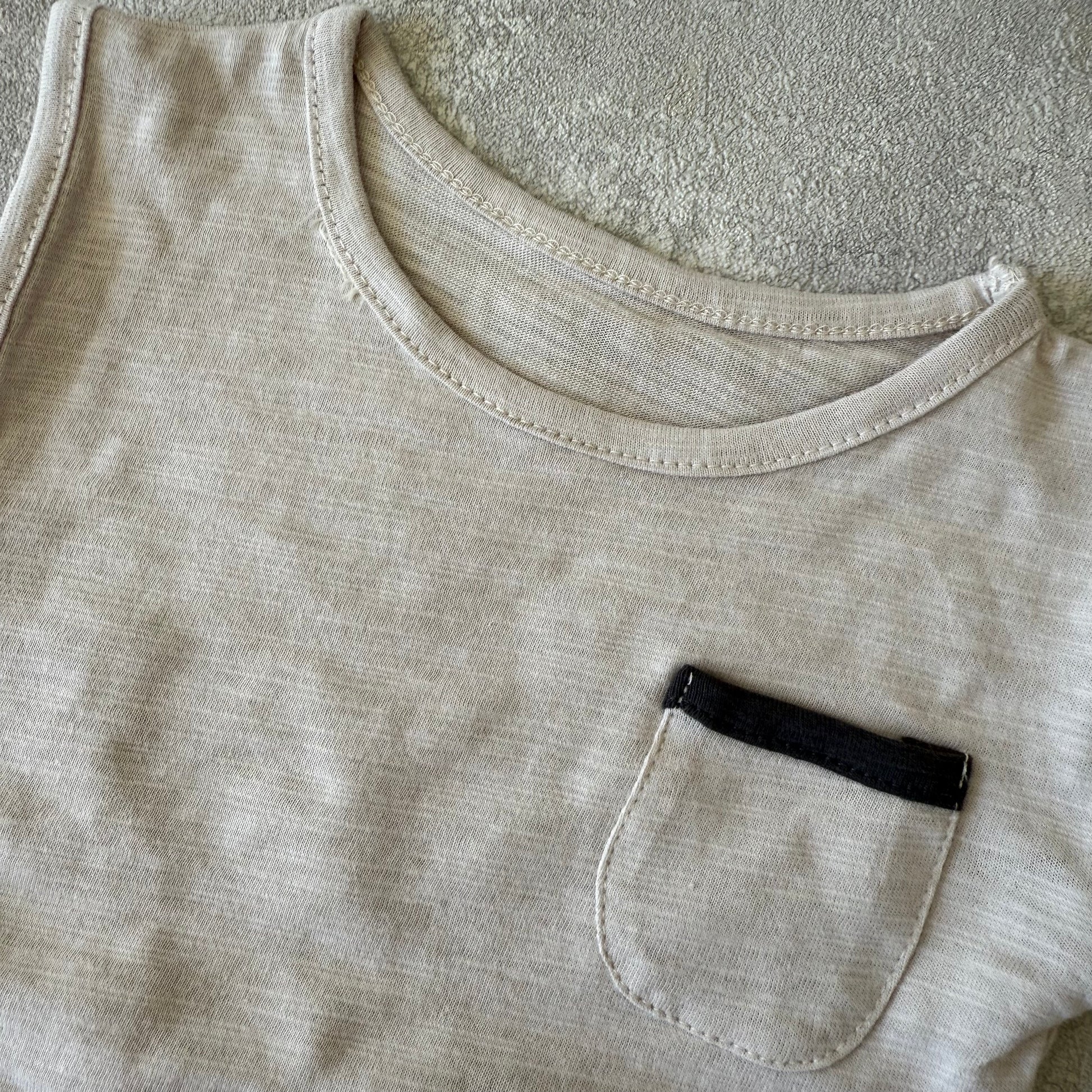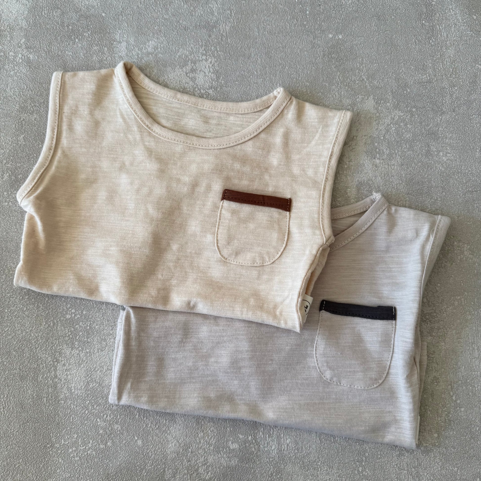 Deze zomerset is perfect voor actieve kinderen die graag vrij bewegen. De set bestaat uit een mouwloos shirt met een subtiel contrasterend borstzakje en een zachte short in aardetinten. Een ideale combinatie van comfort en stijl, dag in dag uit.