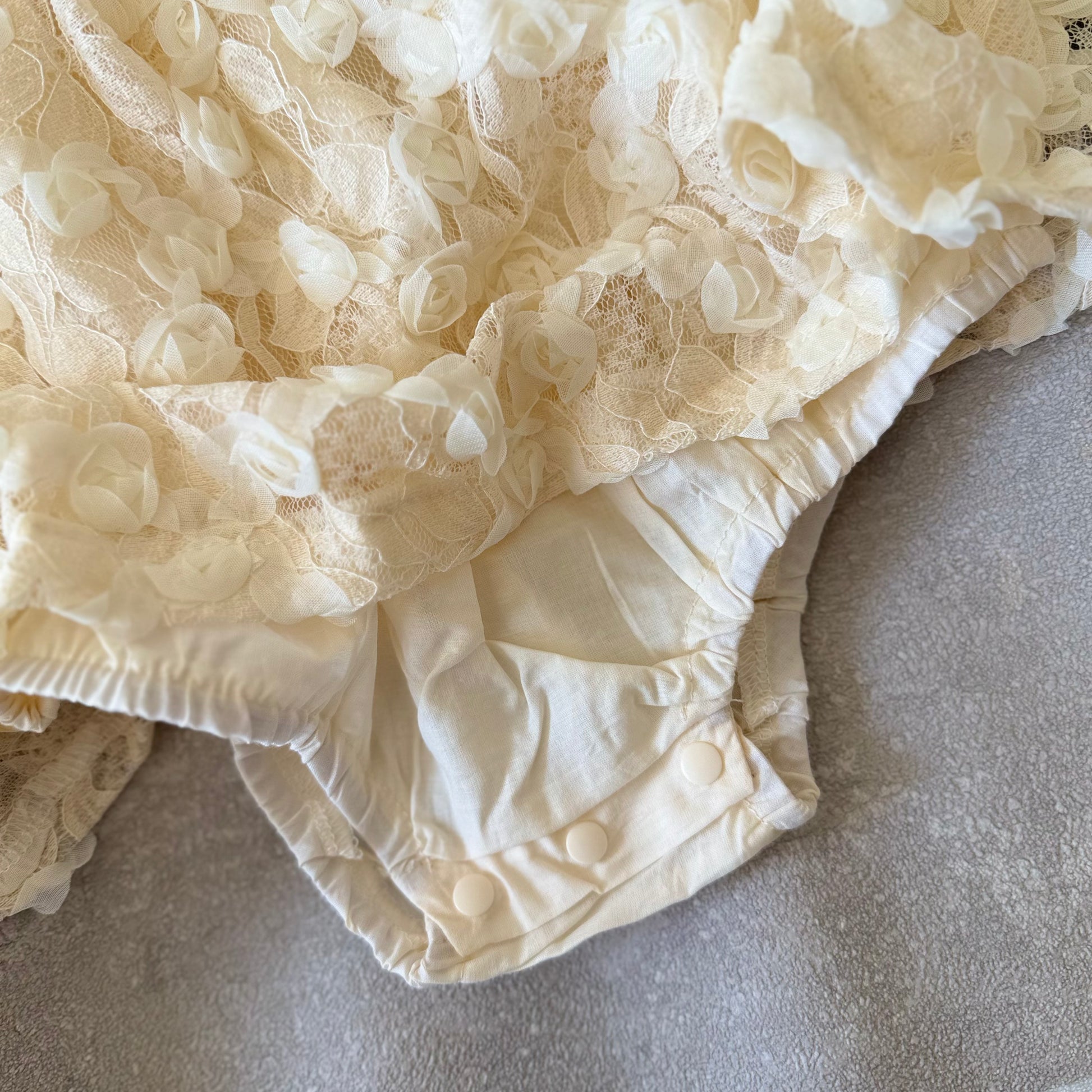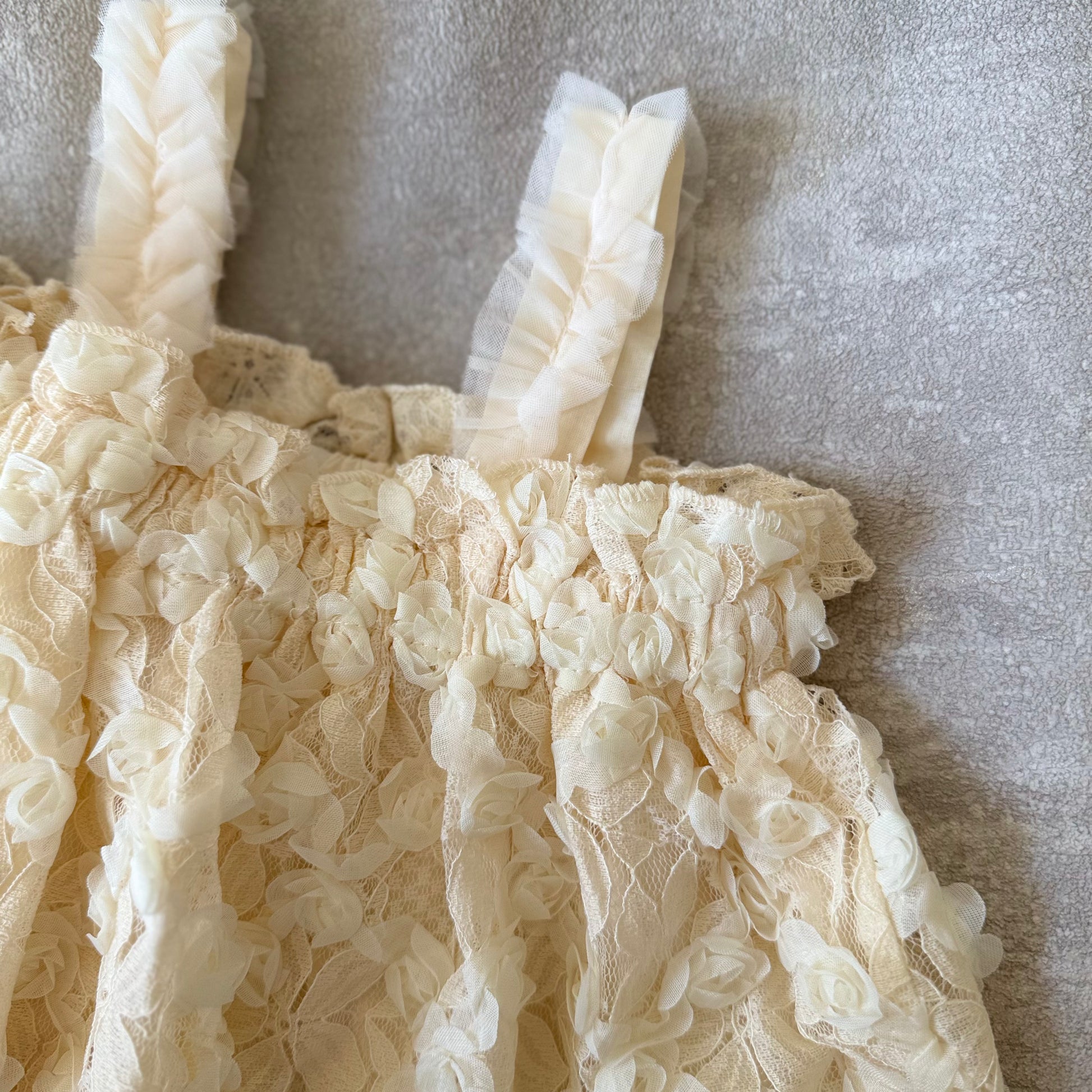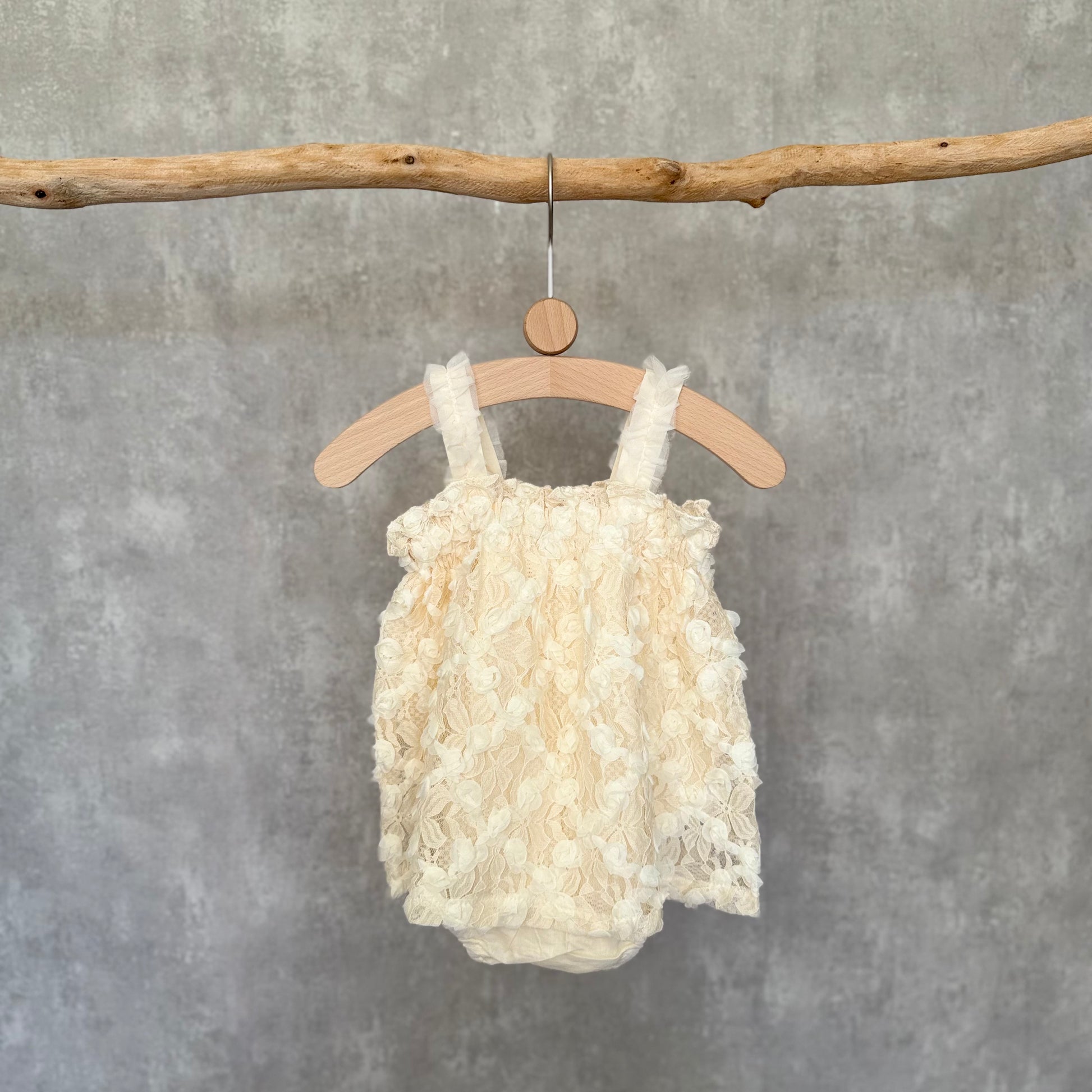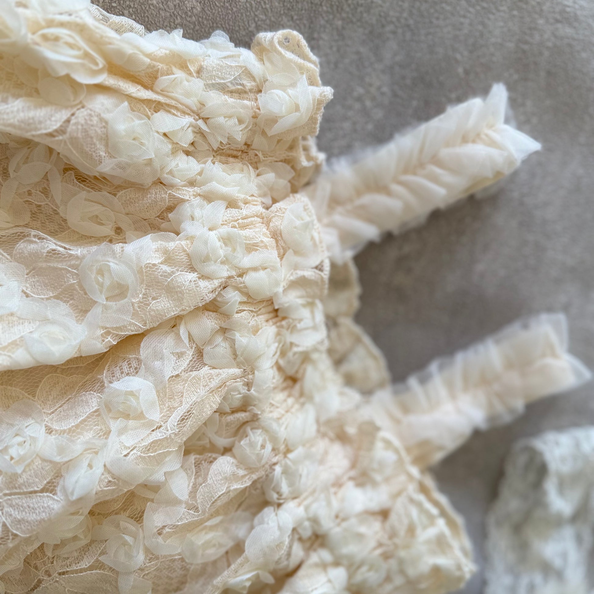 Een mooie eerste jurk, ideaal voor een eerste verjaardag. Zachte stof voor een klein prinsesje. Een bloempje dat stilletjes tot bloei komt.