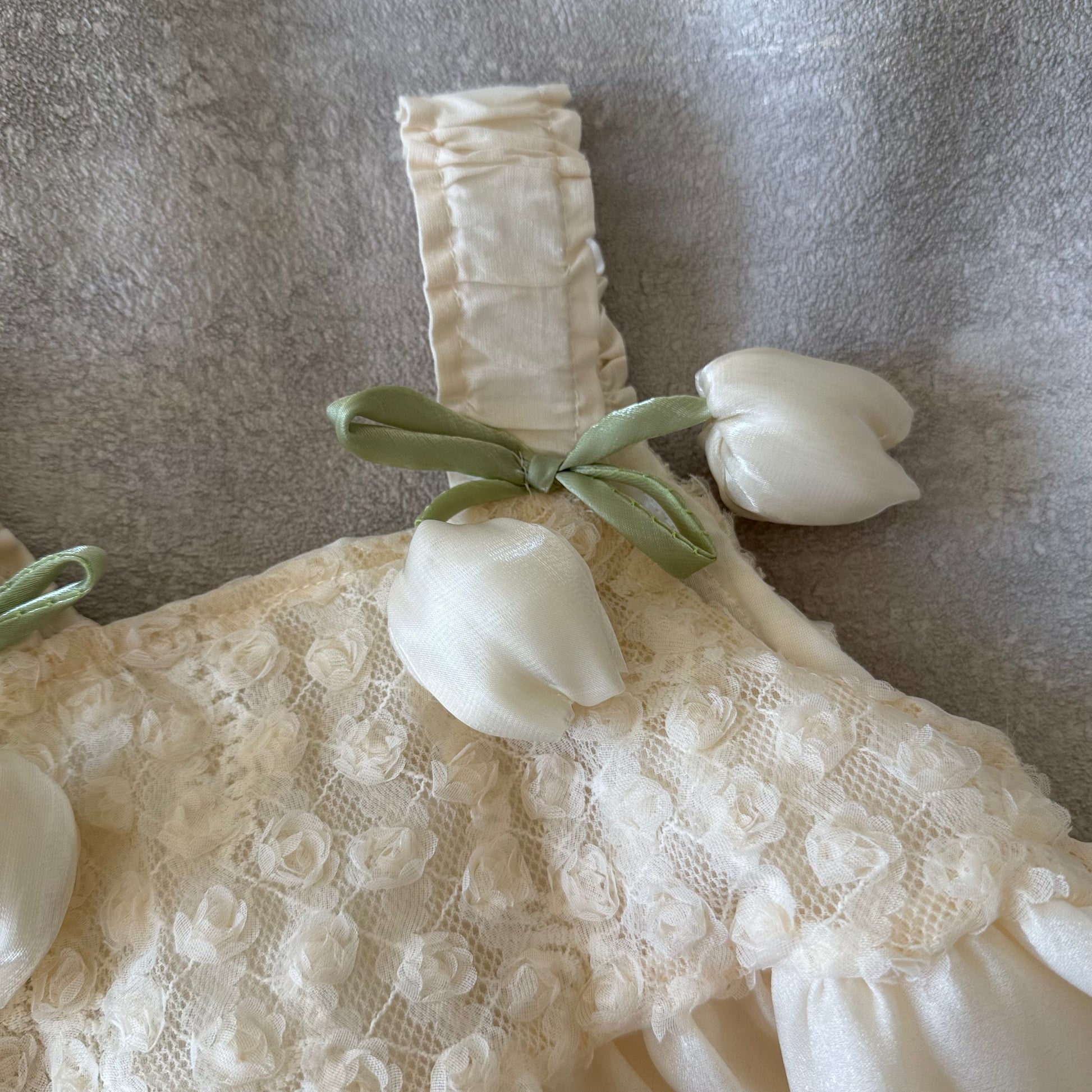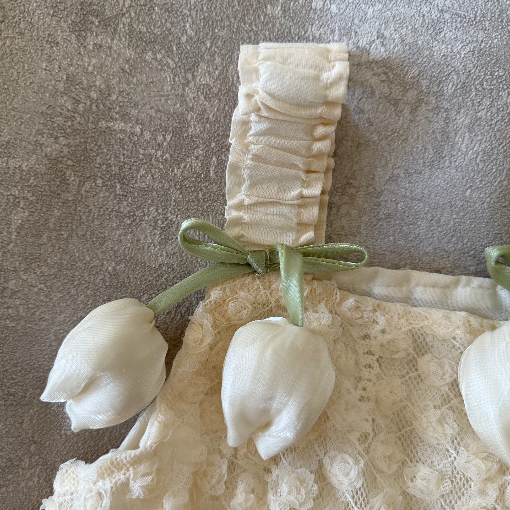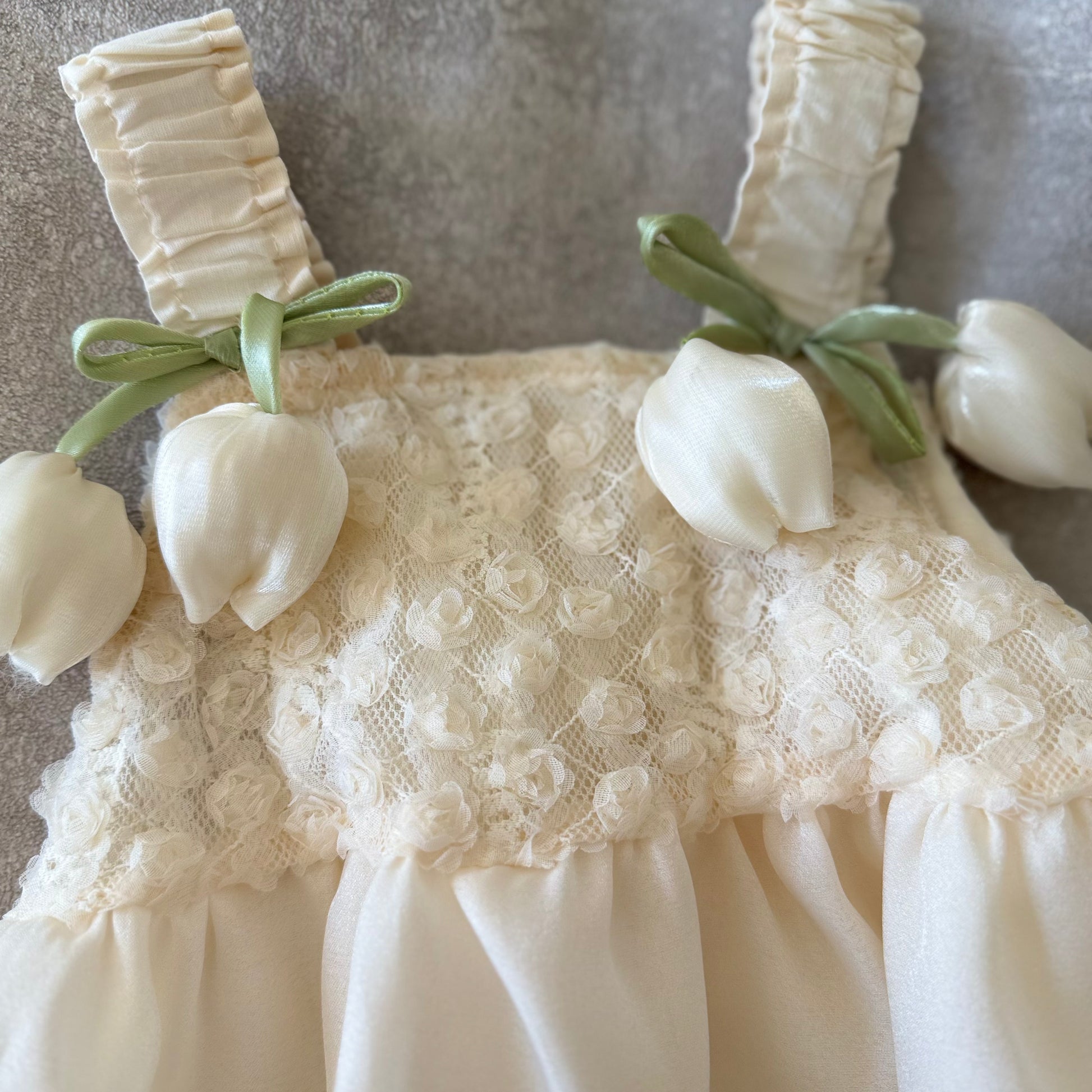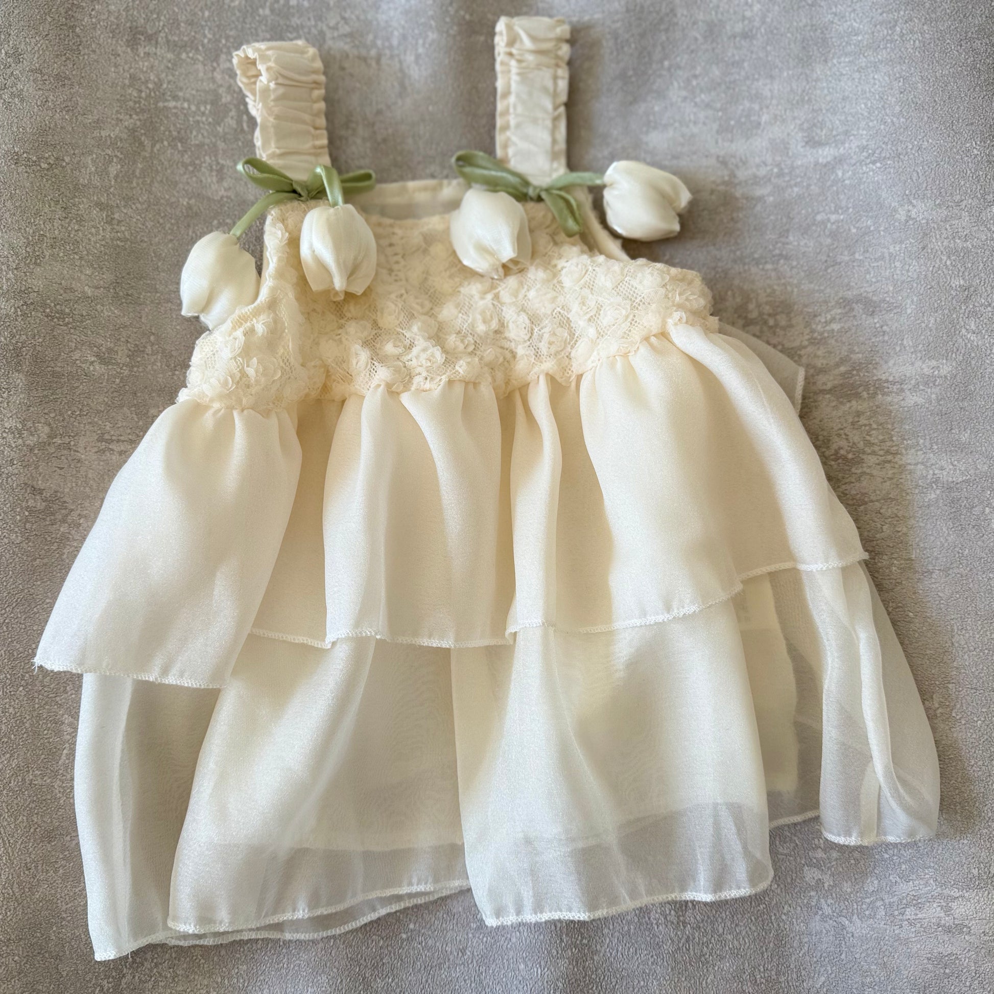Een jurkje versierd met tulpen, een vleugje magie van een allereerste prinsessenjurk. Geïnspireerd door de bloemenpracht van Nederland en gemaakt voor het sprookje van elk klein meisje.