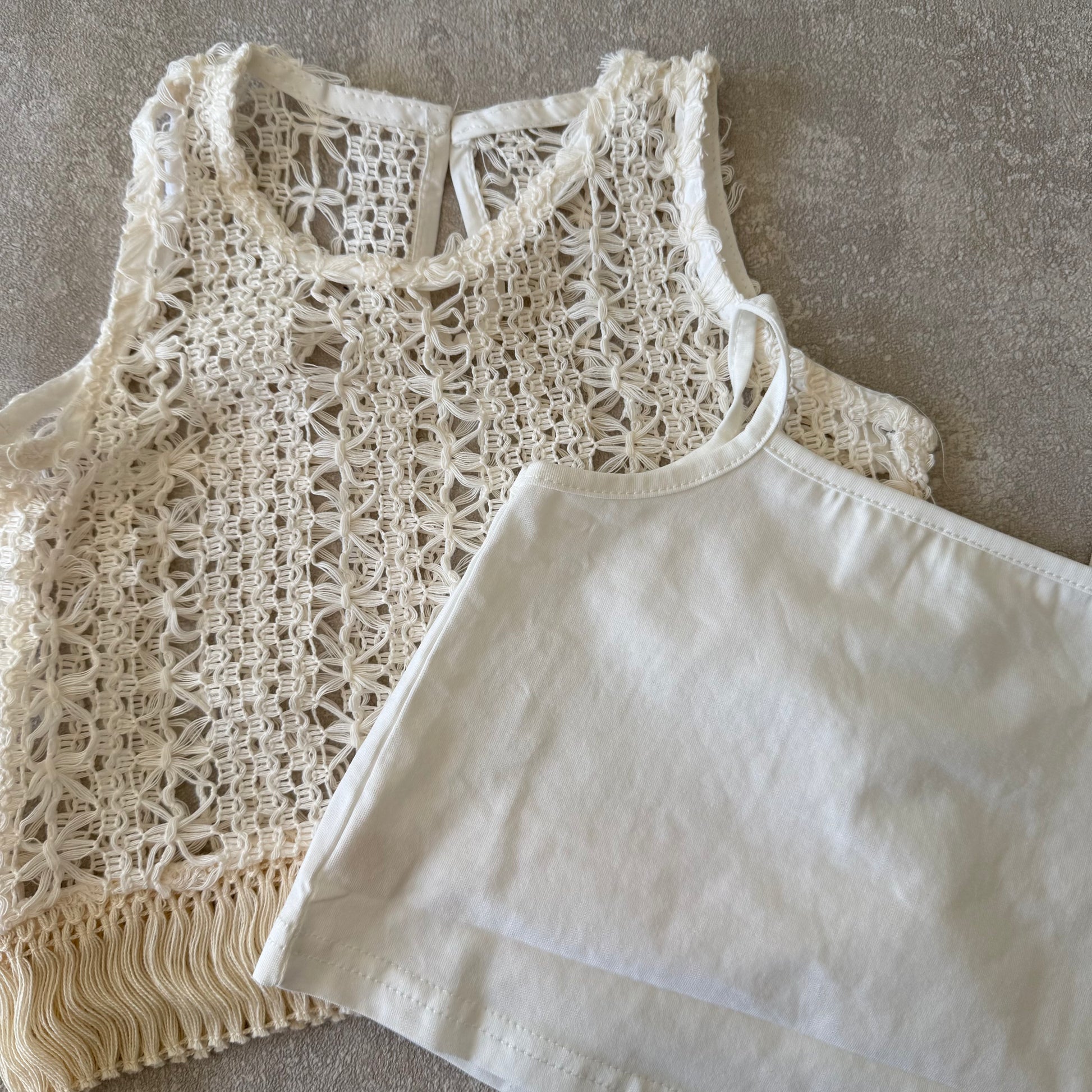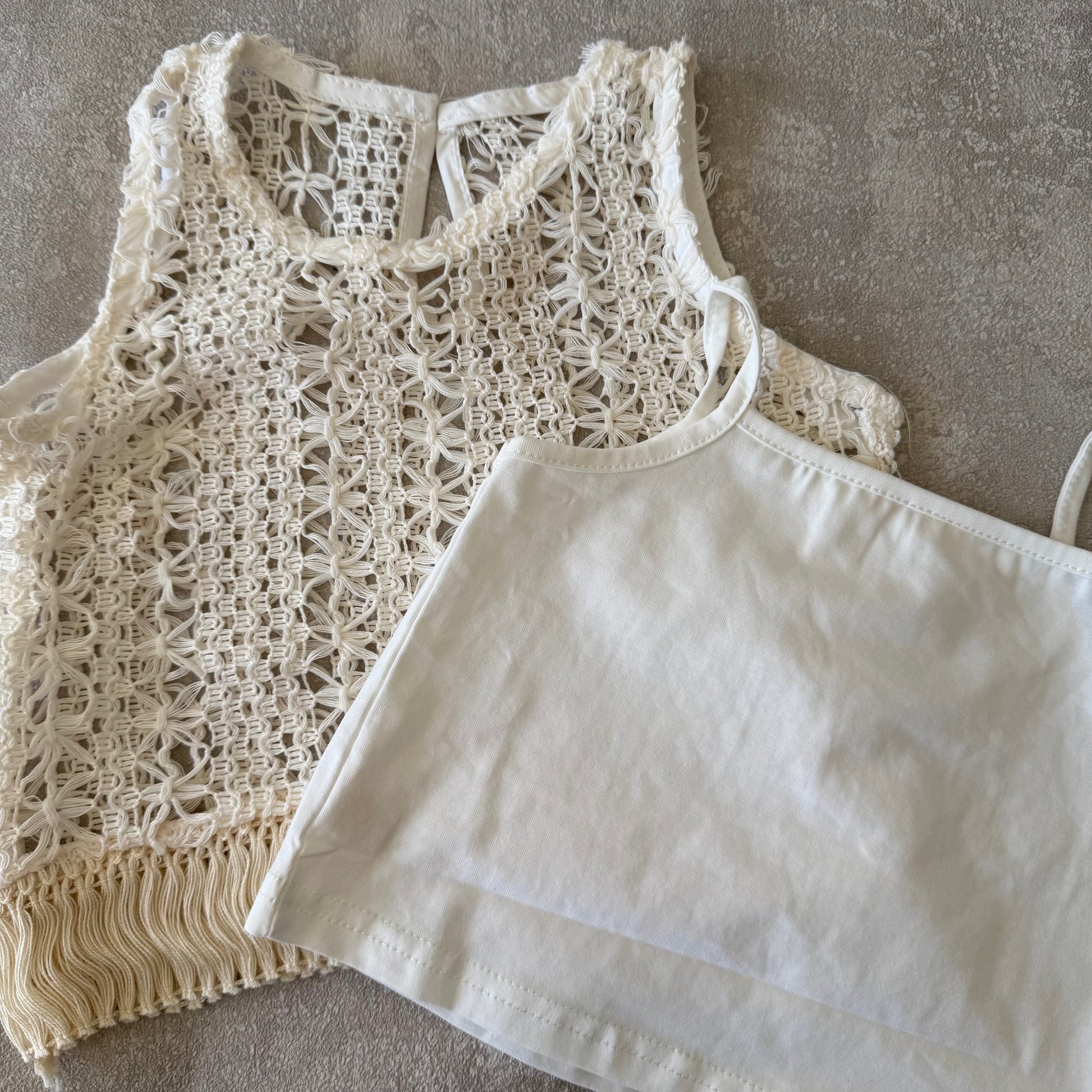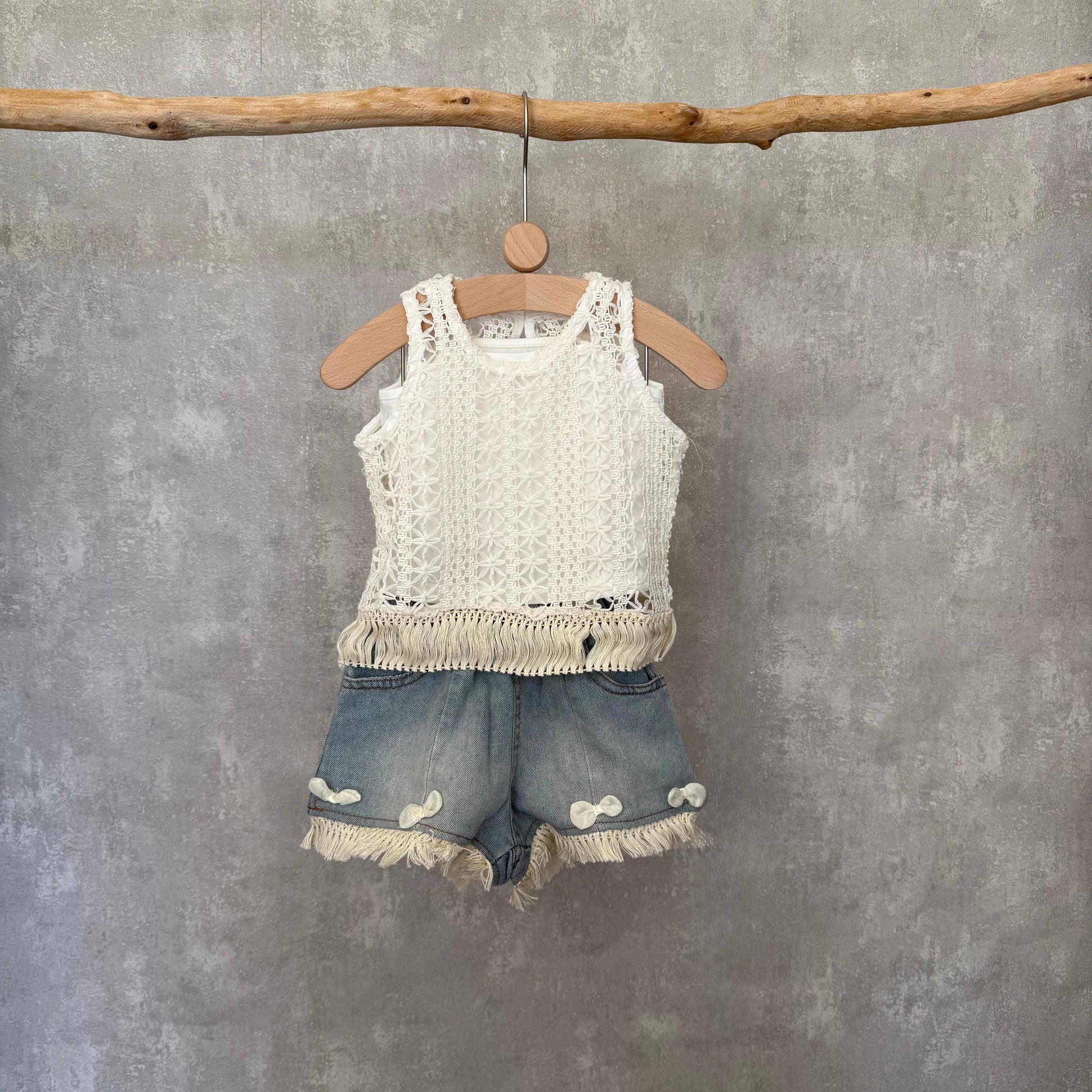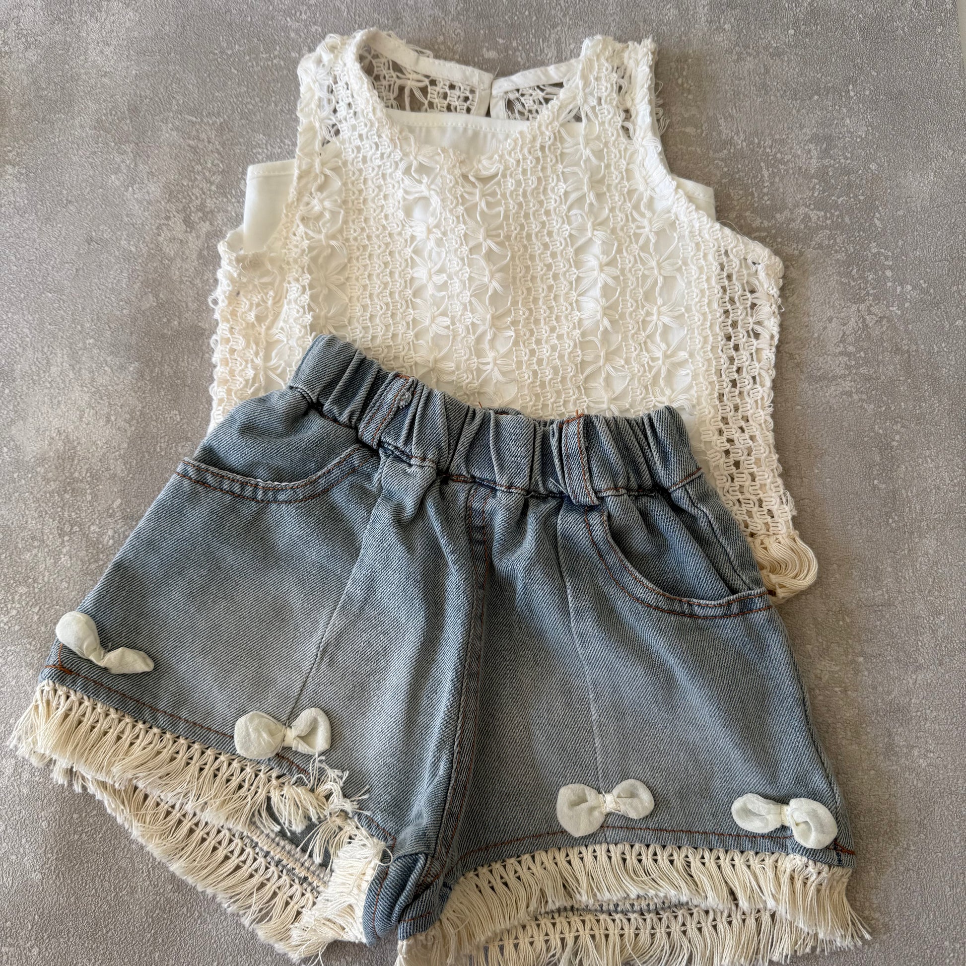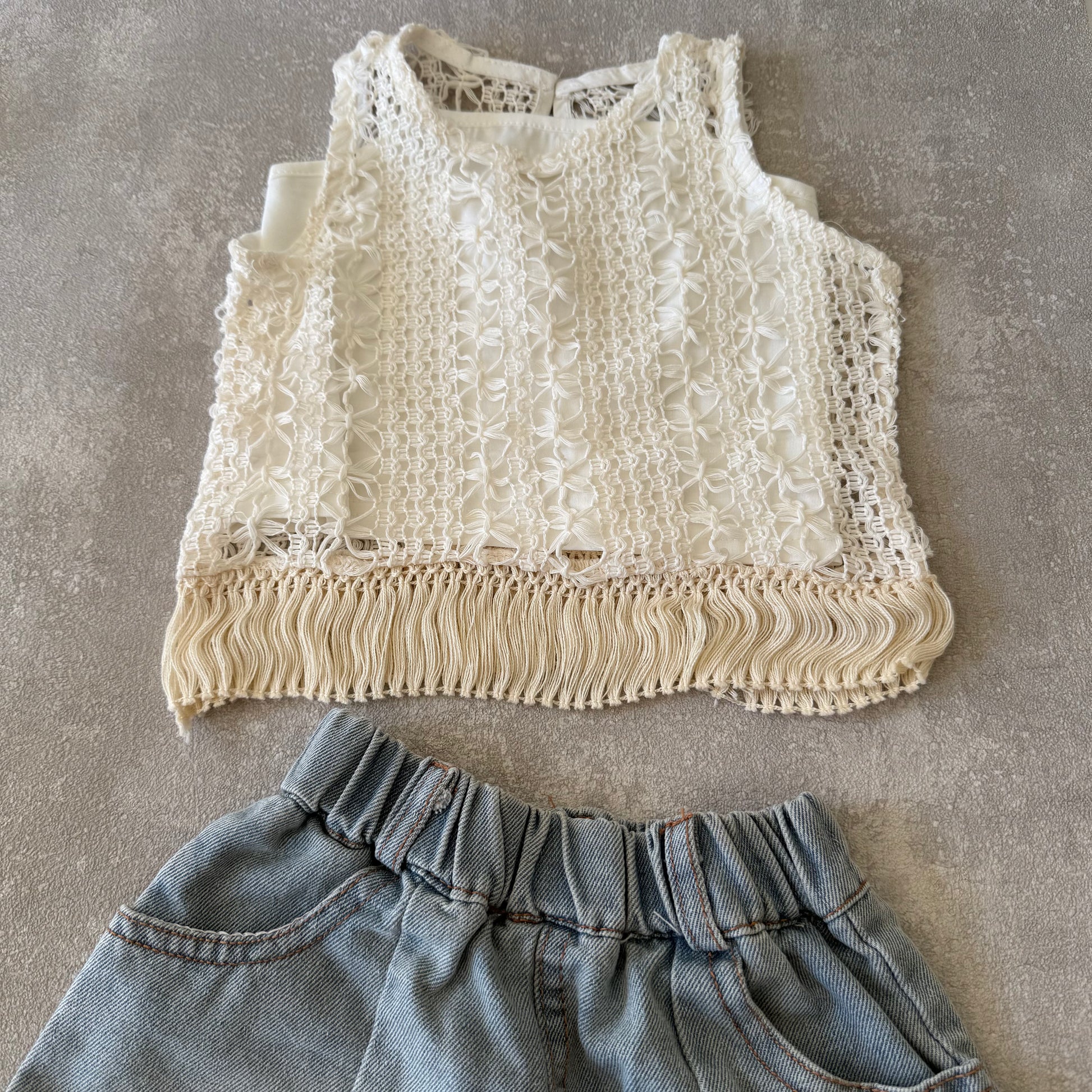 Een set met een shirt, vest en korte spijkerbroek